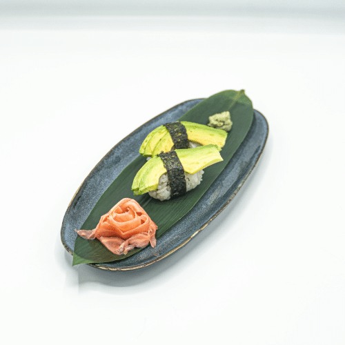 Binnenin: tamago, komkommer en tofu. Bovenop: avocado, teriyakisaus en sesamzaadjes