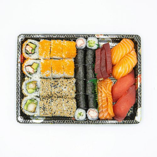 Zalm sashimi, tonijn sashimi, huisgemaakte surimi-krab salade, komkommer, mais en edamame boontjes