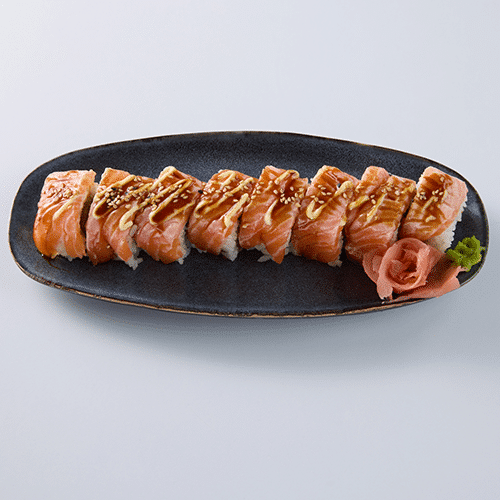 Binnenin: krabsticks, avocado, chuka wakame, krokante uitjes en Japanse mayonaise. Bovenop: gevlamde zalm, avocado, Japanse mayonaise, sriracha saus en sesamzaadjes
